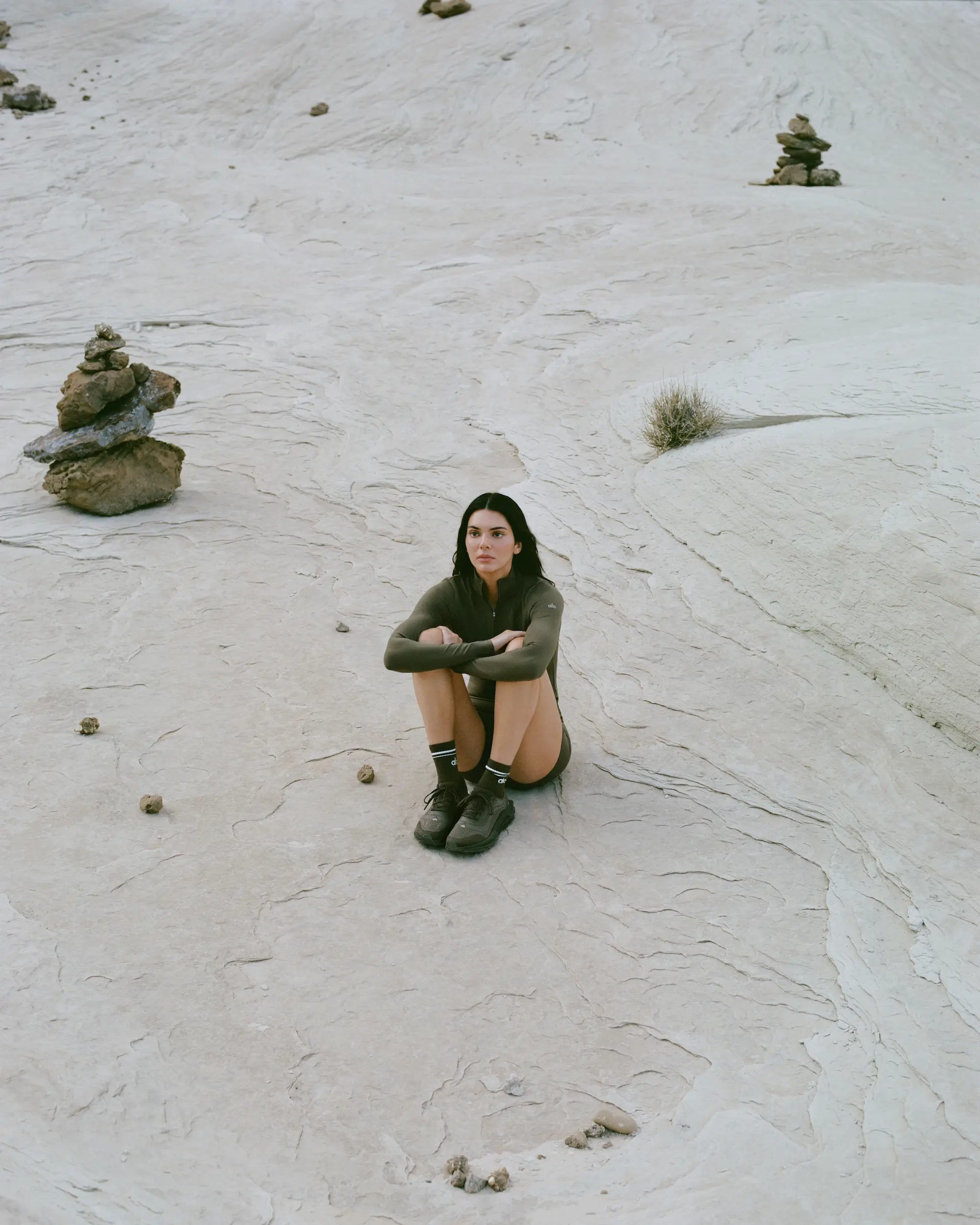 The campaign, shot against the desert minimalism of Amangiri, shows Jenner in sleek sets that move effortlessly from a mat Pilates class to an espresso run. The muted green works like a neutral but feels fresher than the usual gray or navy, grounding the sporty silhouettes in something a little more refined.