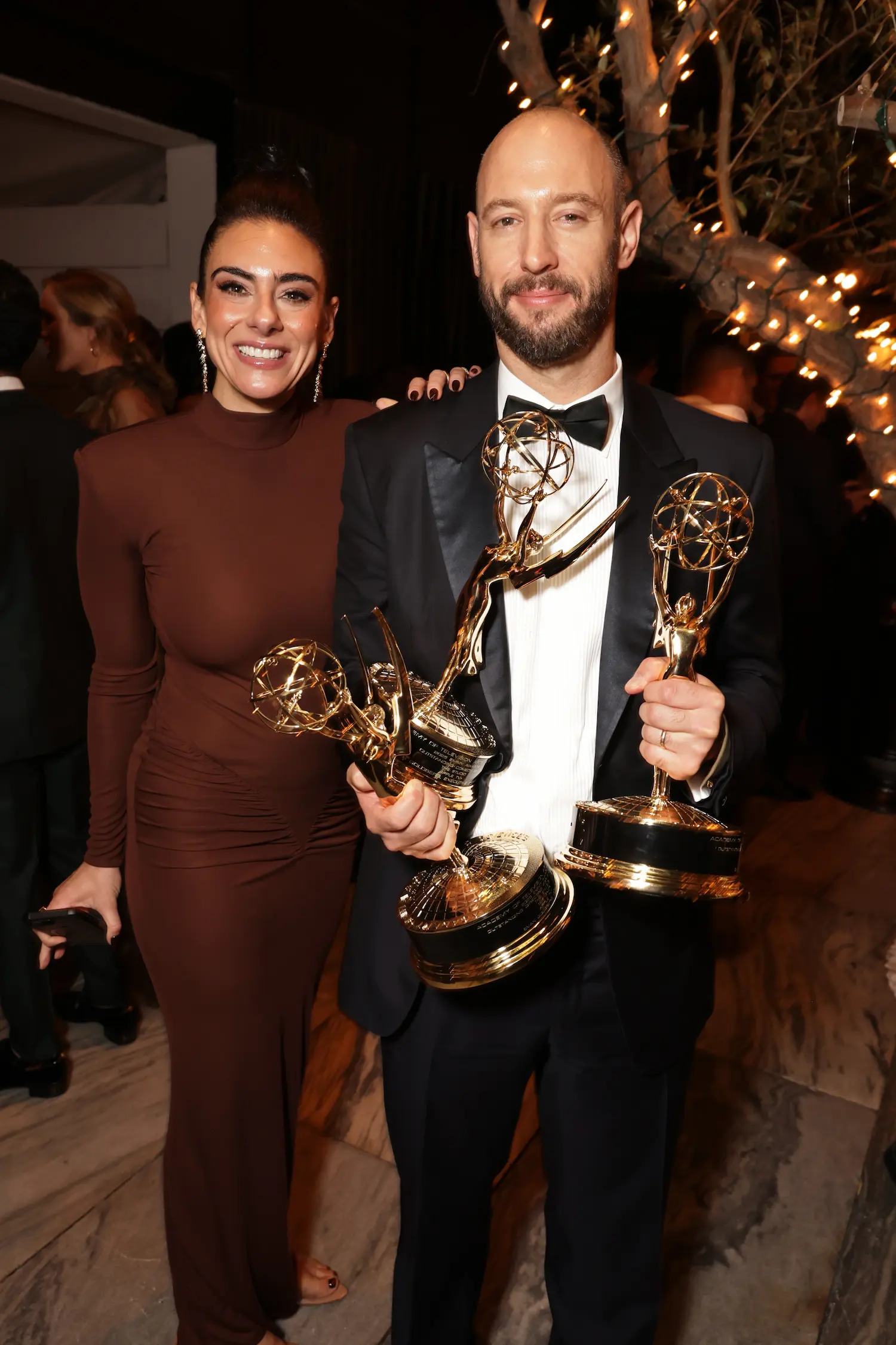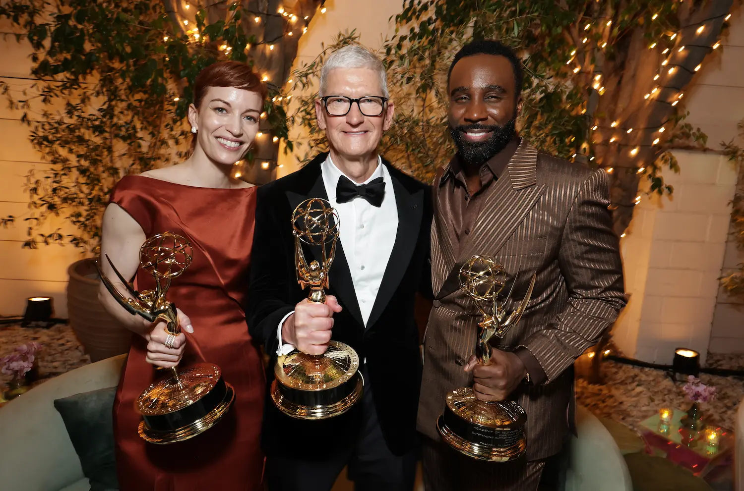 Apple CEO Tim Cook was spotted alongside Seth Rogen and Evan Goldberg, whose comedy The Studio made Emmy history with 13 wins—more than any freshman comedy before it. The celebration also drew cast members and nominees including Ike Barinholtz, Kathryn Hahn, and Catherine O’Hara from The Studio, as well as Adam Scott, Patricia Arquette, and Ben Stiller.
