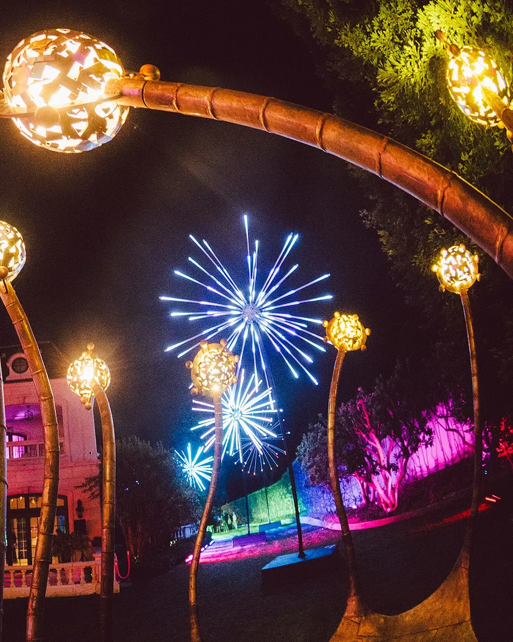 The estate’s sprawling grounds transformed into a neon dreamscape, featuring installations by Insomniac, Liquid PXL, and @11d.agency. Guests roamed through oversized art pieces, snapped photos in a Parívie-branded selfie lounge, and indulged in truffle caviar and gummy bear ice cream sundaes.